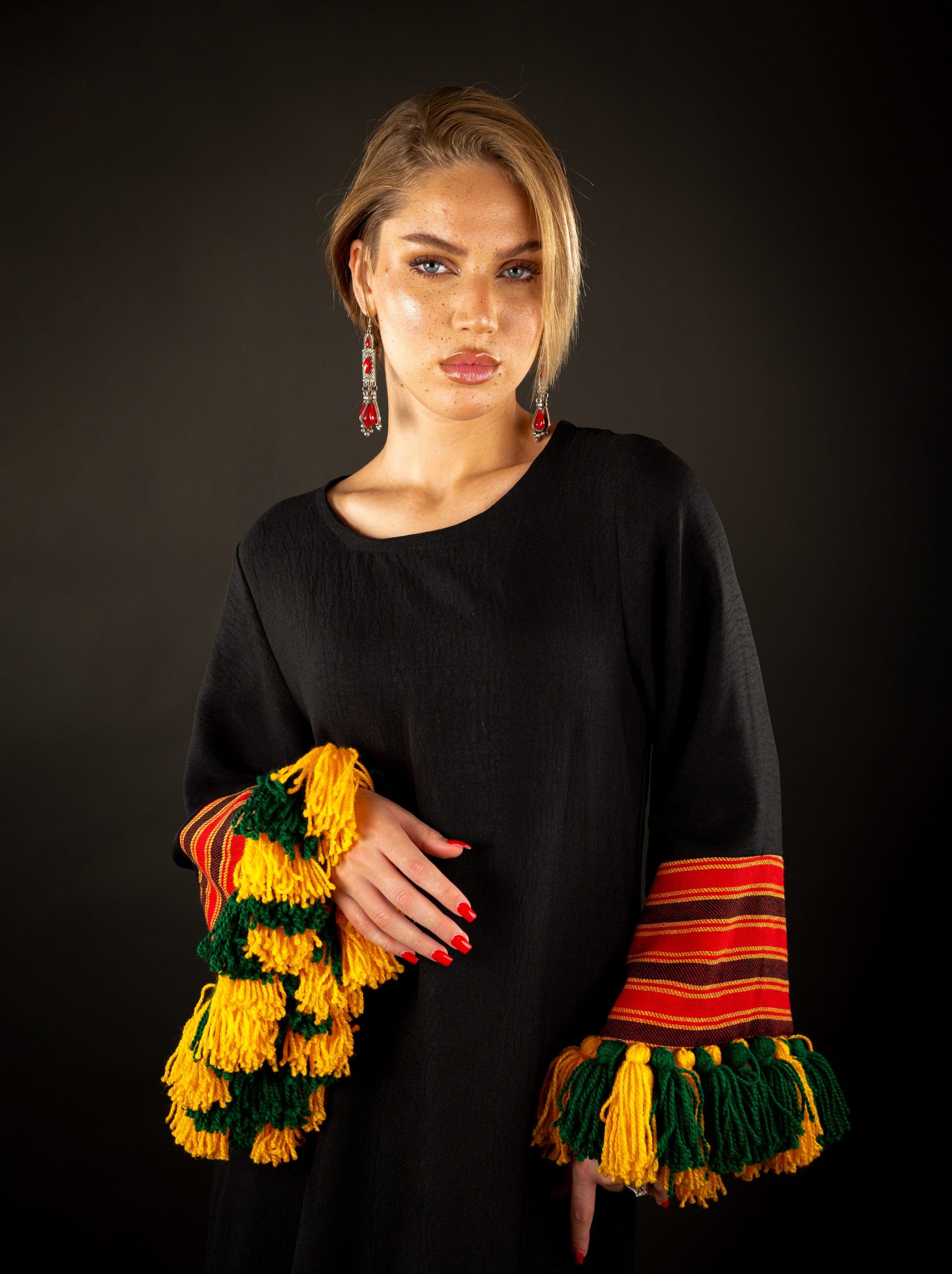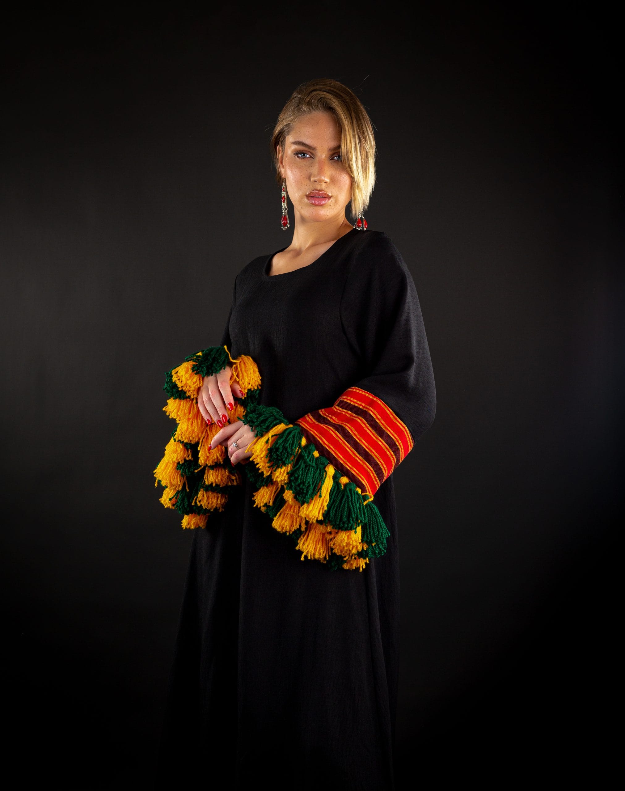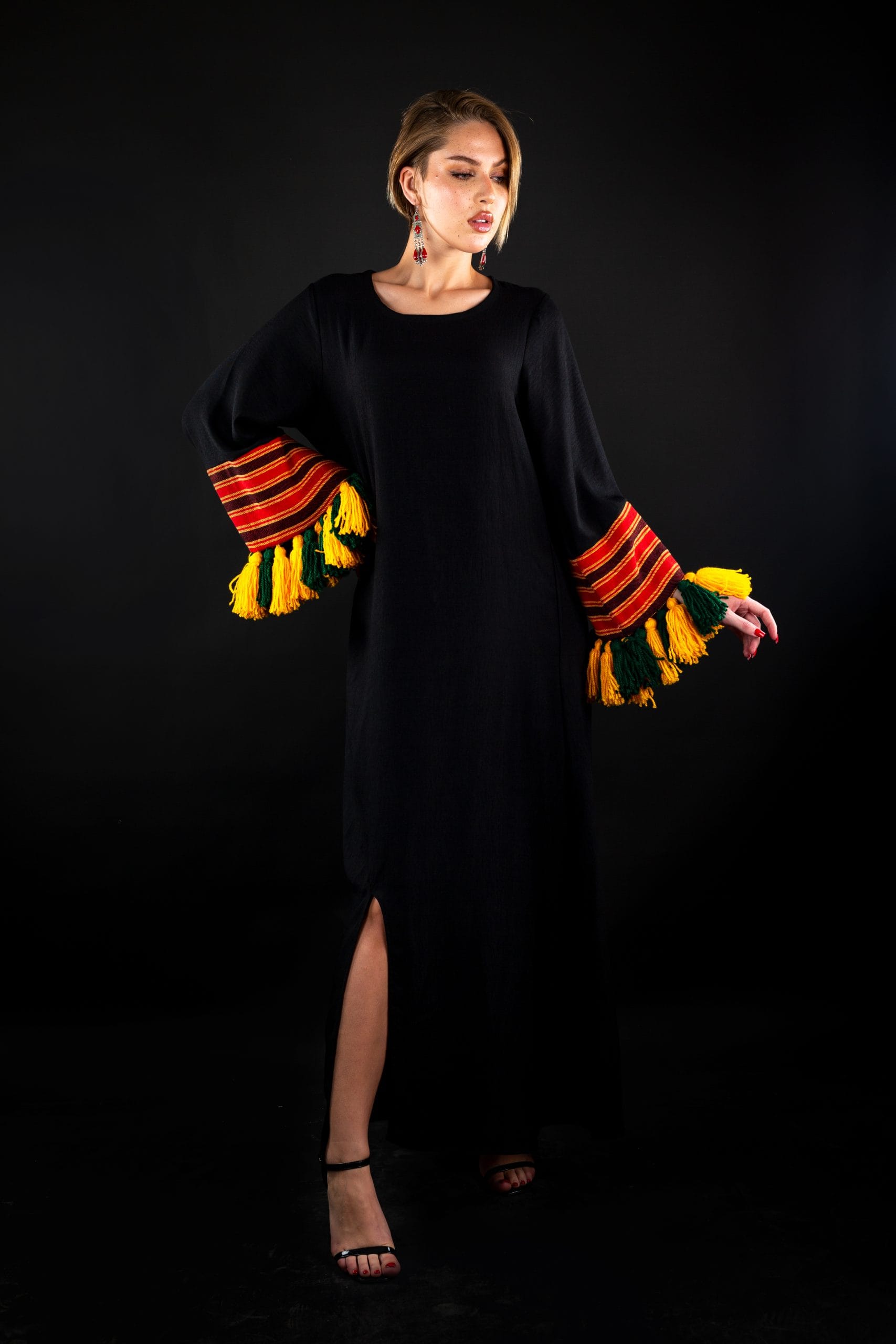 la robe est conçue en lin froissé de très haute qualité en forme évasé ,avec des manches amples et chwicha sur les bord,ideals pour des occasions spéciales