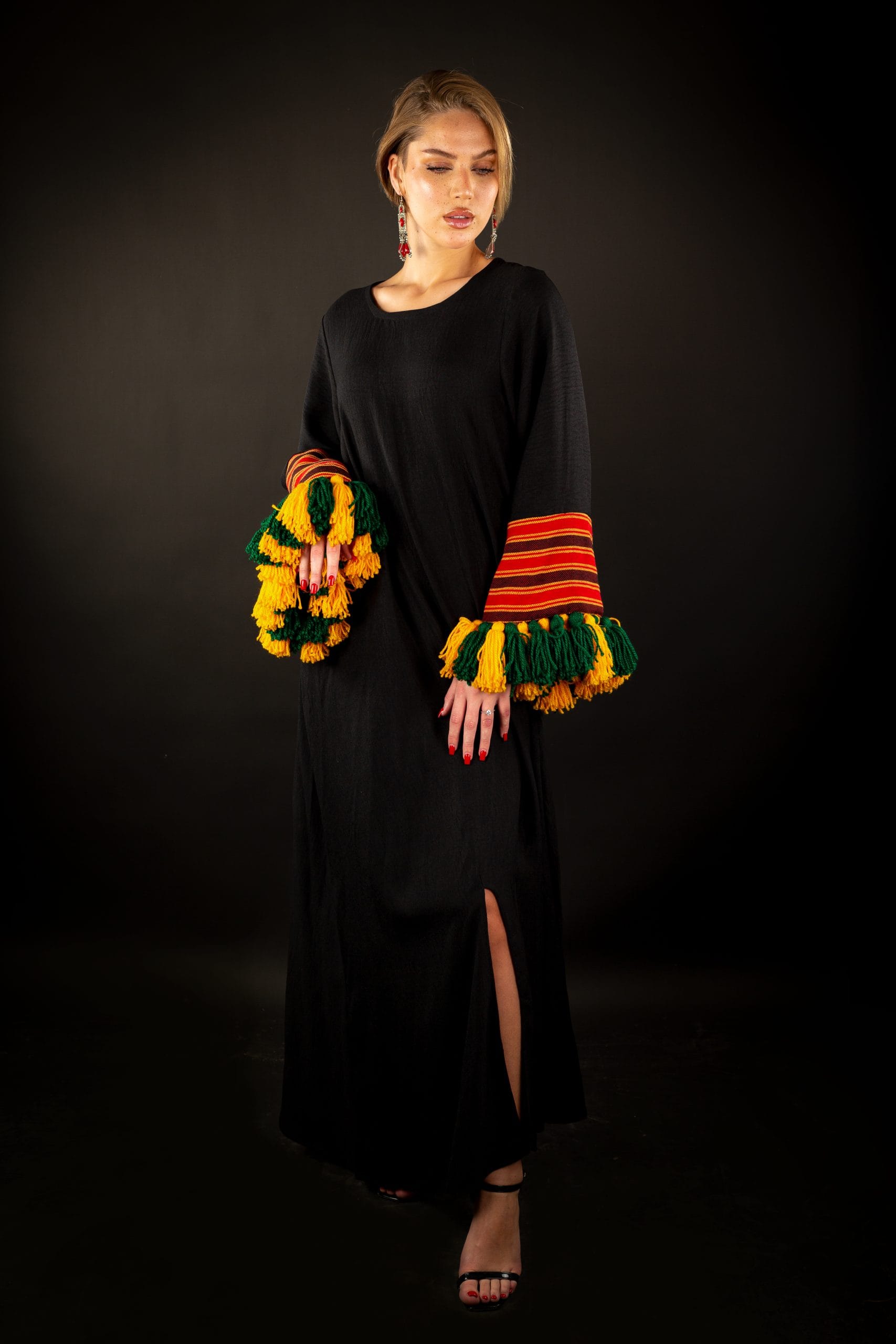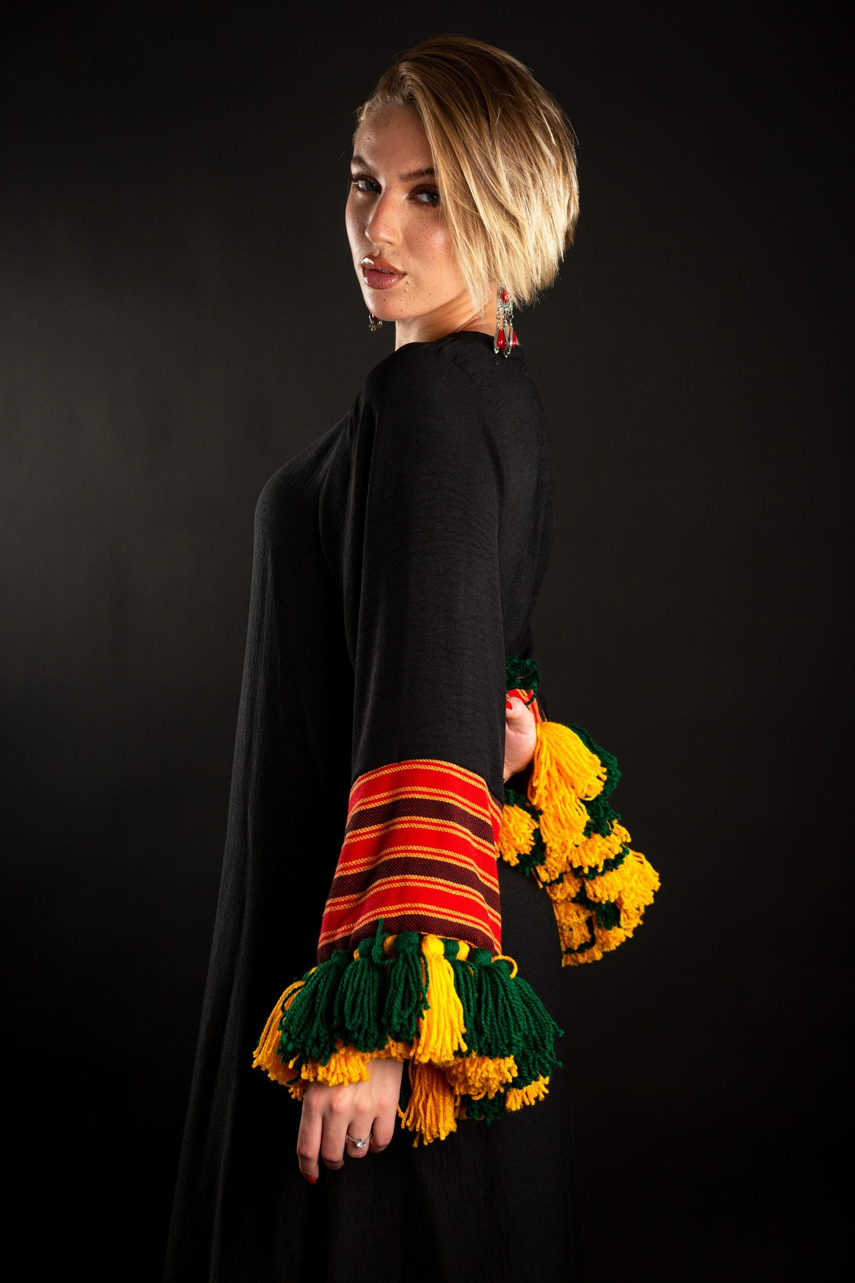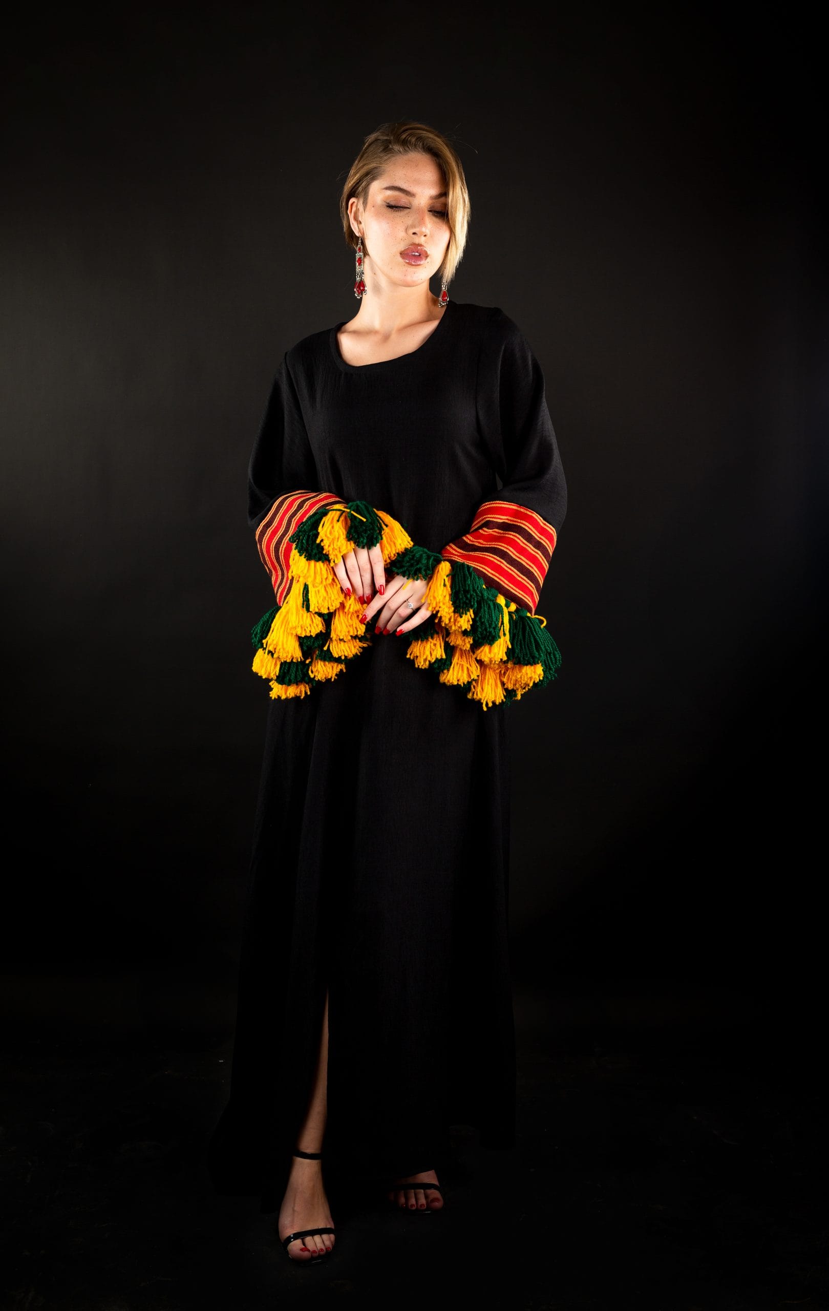 la robe est conçue en lin froissé de très haute qualité en forme évasé ,avec des manches amples et chwicha sur les bord,ideals pour des occasions spéciales